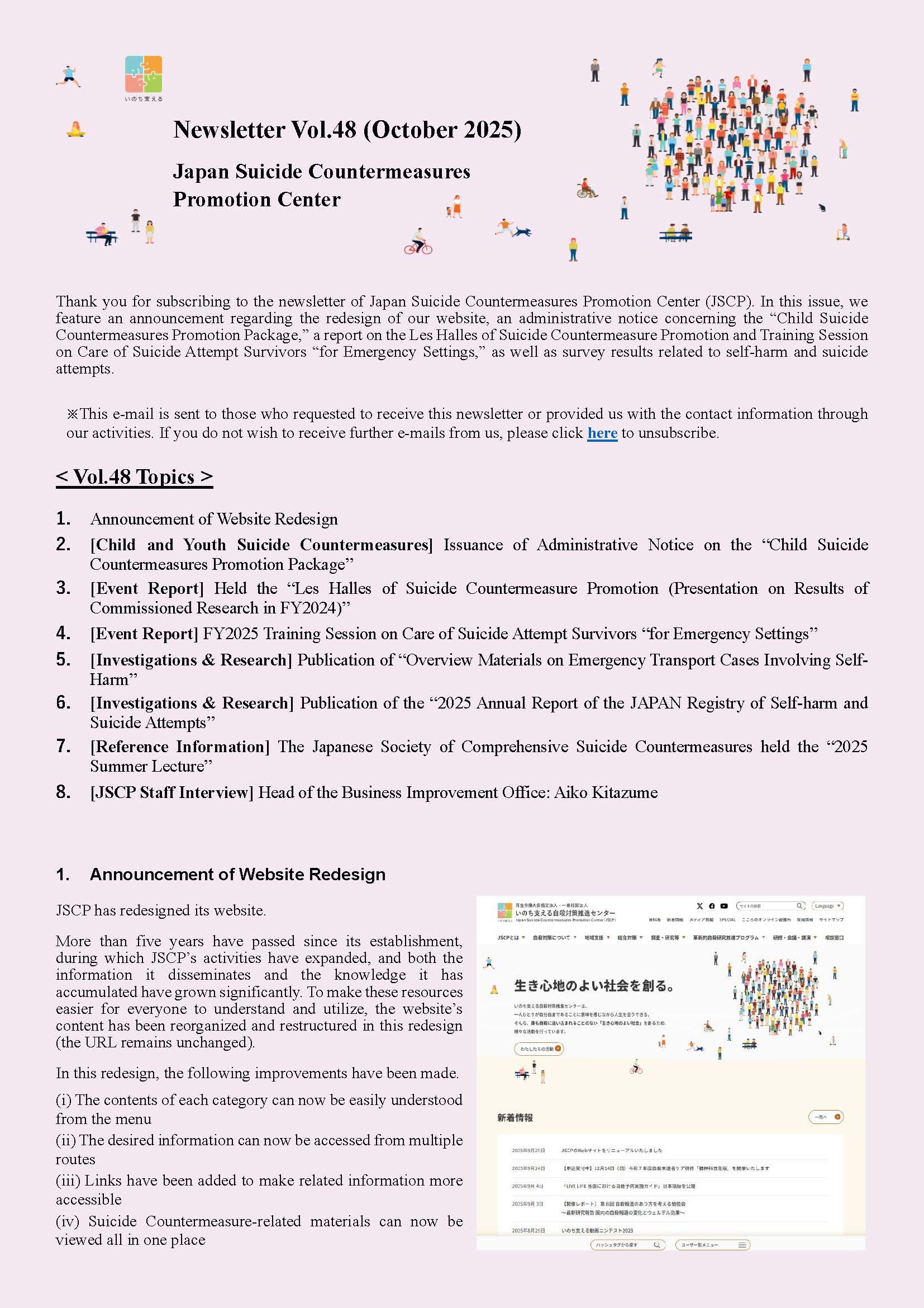 Please subscribe to the JSCP newsletter to stay updated on the latest suicide countermeasure efforts.