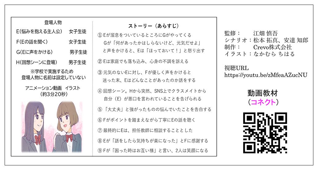この調査・分析を踏まえ、SOS教育の地域連携モデルとなるプログラムを作成。プログラムは1回50分の2回構成で、1回目の授業は、SOSを出す側に焦点を当て、「ストレスに関する学習」「相談への不安や抵抗感」「様々な相談先の紹介」などについて地域の専門職職員が担当。2回目は友人へのサポート方法を学ぶことを目的に、「相談の有益性」「友人への声掛けの方法」「話を聴くポイント」などについて担任教師が担当しました。また、研究チームでは、生徒が理解しやすいように、友人からの相談や声掛けを題材にしたアニメーション動画(*2)を作成し、あわせて活用したのも特徴です。