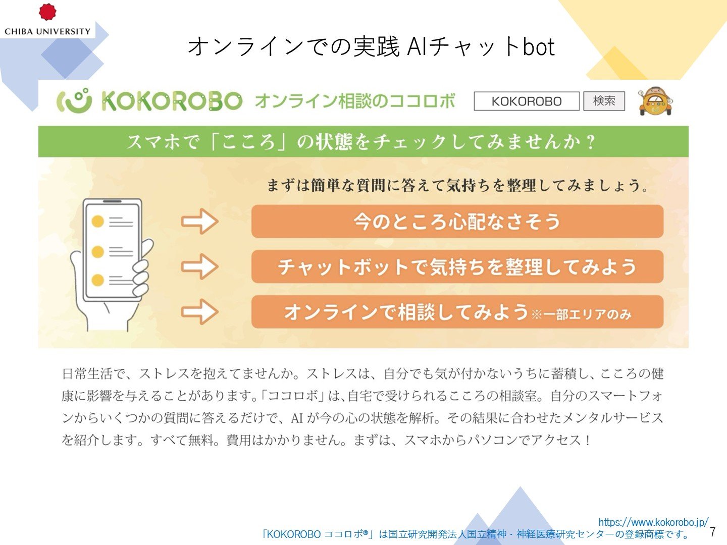 「KOKOROBO (ココロボ)」は、国立精神・神経医療研究センターが開発した、メンタル不調の予防と不調のある方への早期手当、さらに必要な方に医療への橋渡しを行う、オンラインによるメンタルヘルスケアシステムです(https://www.kokorobo.jp/)。本研究では、「KOKOROBO」の研究開発者と協働し、2023年に千葉市、24年に銚子市で社会実装するとともに、こどもが使用しやすい方法などを検討しました。